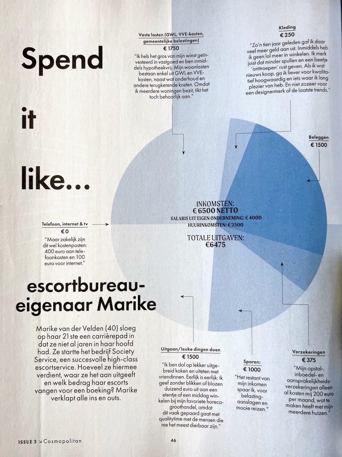 Op 1 juni 2024 publiceerde Cosmopolitan Magazine een artikel over Society Service. Deze keer werd eigenaresse Marike geinterviewd over haar uitgavepatroon en haar werk als eigenaresse van een high class escortservice voor de rubriek 'Spend it like'. U kunt het artikel hier beneden bekijken en lezen, wat ook gepubliceerd werd op de website van Cosmopolitan.