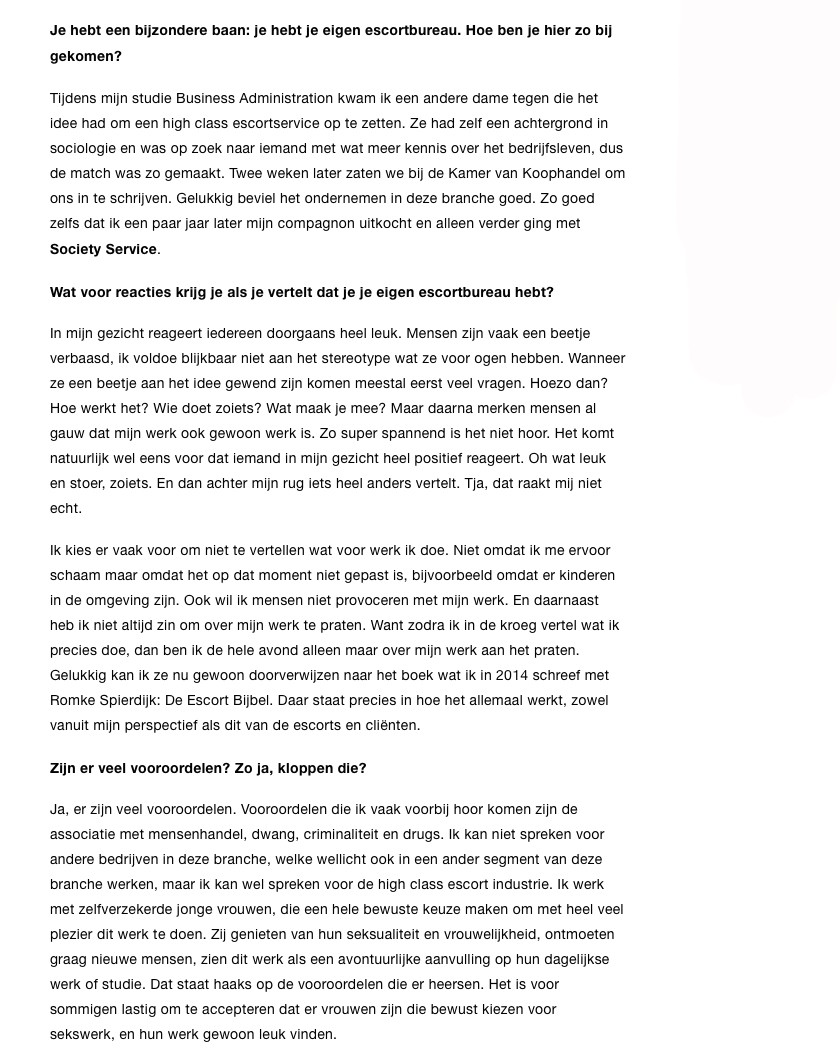 "Tijdens mijn studie Business Administration kwam ik een andere dame tegen die het idee had om een high class escortservice op te zetten. Ze had zelf een achtergrond in sociologie en was op zoek naar iemand met wat meer kennis over het bedrijfsleven, dus de match was zo gemaakt. Twee weken later zaten we bij de Kamer van Koophandel om ons in te schrijven. Gelukkig beviel het ondernemen in deze branche goed. Zo goed zelfs dat ik een paar jaar later mijn compagnon uitkocht en alleen verder ging met Society Service."